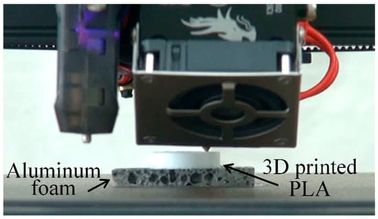 The aluminum foam used in this study was fabricated from Al-Si-Cu aluminum alloy ADC12 die-casting sheets by the friction stir welding method [,], which is one of the precursor methods. In the precursor method [,], solid aluminum mixed with a foaming agent called a precursor is heated to generate pores in the aluminum by the gas generated by the decomposition of the foaming agent, resulting in foaming. In the friction stir welding method, a foaming agent powder is placed between two aluminum sheets and friction stir welding is performed on top of the foaming agent powder to mix the foaming agent powder into the aluminum sheets. The resulting precursor is heated for foaming. The resulting aluminum foam was machined into thin sheets of approximately 5 mm in thickness. Then, the aluminum foam sheet was placed in an electric furnace preheated to 380–400 °C for three hours to fully heat the aluminum foam. In preliminary experiments, when the heating time was longer than 2 h, the entire aluminum foam was sufficiently heated, resulting in a constant temperature of the aluminum foam when it was taken out. In the present study, the holding time was 3 h, taking into account the variability. It took about 1–2 min to take the aluminum foam out of the electric furnace and place it on the 3D printer. In a preliminary experiment, the temperature of the aluminum foam when it was extracted from the electric furnace and placed on the 3D printer was measured using thermocouples. The temperature at the start of printing was 80–200 °C, and the temperature at the end of printing the first layer was about 70–80 °C. Although the temperature at the start of printing varied, the temperature dropped rapidly and the first layer was printed at almost 70–80 °C. Note that the aluminum foam was fabricated by the foaming precursor near the melting point of aluminum. The precursor starts foaming gradually when it is heated above the solidus temperature and foams rapidly above the liquidus temperature []. In the case of ADC12, the solidus temperature is 515 °C and the liquidus temperature is 580 °C []. Because the heating temperature of the aluminum foam sheet in this study was sufficiently lower than the foaming temperature, no shape changes in aluminum foam, such as pore deformation or re-foaming behavior [,], were observed.