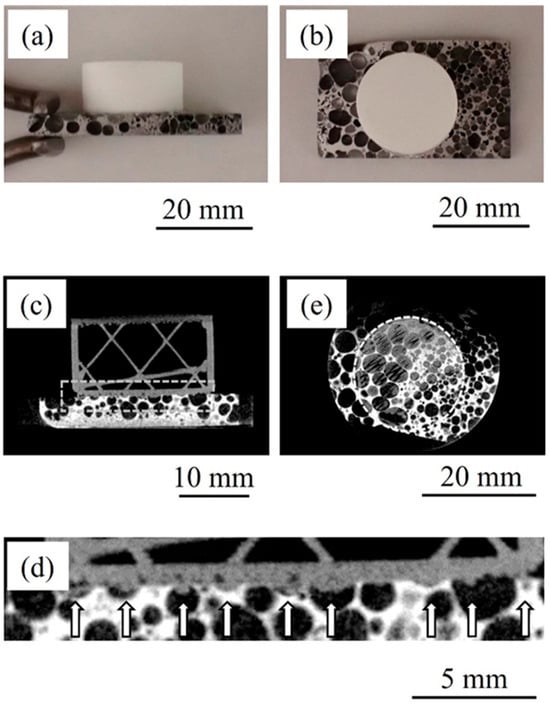 Bonded sample in which resin was directly printed on heated aluminum foam. (a) Side view. (b) Top view. (c) X-ray CT image viewed from side. (d) Enlarged image of dotted box in (c). White arrows show where the resin penetrated into pores. (e) X-ray CT image viewed from above.