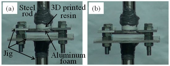 Figure 4 shows a tensile test of the bonded sample in which resin was directly printed on heated aluminum foam. A steel round bar was bonded to the resin on the upper side, and the aluminum foam on the lower side was pulled by a jig made from an aluminum alloy sheet and a round steel bar. Figure 4a shows the initial state before conducting the tensile test and Figure 4b shows the sample after fracture. Fracture occurred at the bonding interface between the resin and aluminum foam. This fracture behavior was similar for both samples directly printed on heated and unheated aluminum foam.