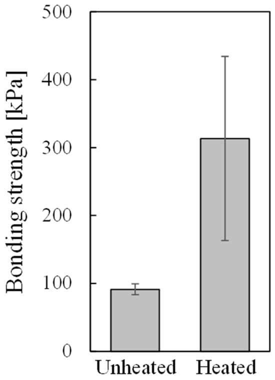 Next, the tensile tests were conducted on the bonded samples to evaluate the bonding strength. A steel round bar with a diameter of 16 mm and a length of 100 mm was attached to the opposite side of the bonding interface using structural adhesive as a tensile jig. Tensile tests were performed with an universal testing machine (Instron 5582, Norwood, MA, USA) at a tensile speed of 1 mm/min. Bonding strength was obtained by dividing the maximum load obtained during the tensile test by the area of the cross-section perpendicular to the tensile direction of the cylindrical resin (the area of a circle 20 mm in diameter).