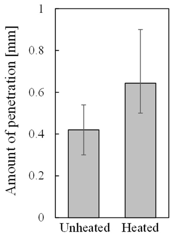 Figure 8 shows the average of the amount of penetration for all samples, and the maximum and minimum amount of resin penetration for those samples that showed the maximum and minimum amount of resin directly printed on unheated and heated aluminum foam. The amount of resin penetration into the pores was obtained by using X-ray CT images parallel to the bonding interface, such as Figure 2e and Figure 3e. The amount of resin penetration was defined as the number of X-ray CT images in which resin was visible multiplied by the slice pitch of X-ray CT images. Although the amount of resin penetration varied from place to place even in a single specimen, it was obtained based on the number of X-ray CT images in which resin was visible even slightly. It can be seen that more resin penetrates into the samples in which resin was directly printed on heated aluminum foam than the samples in which resin was directly printed on unheated aluminum foam. This suggests that heating aluminum foam for printing softens the resin and allows more resin to penetrate into the pores during printing. This large amount of penetration is considered to cause a high anchor effect; therefore, higher bonding strength was obtained for the sample in which resin was directly printed on heated aluminum foam than for the sample in which resin was directly printed on unheated aluminum foam as shown in Figure 5.