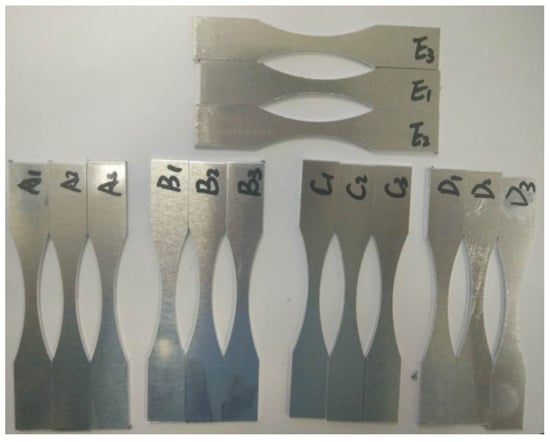 The MTS hydraulic servo fatigue testing machine was used for fatigue cyclic test. The device is from MTS Corporation in Eden Prairie, MN, USA, as shown in Figure 2. The test was carried out at room temperature and the loading frequency was set to 50 Hz. The specimen was fixed at the left end and the cyclic load was applied at the right end. The stress ratio R was 0.1. The minimum load was 320 N and the maximum load was 3200 N. In order to obtain the damage conditions of the aluminum alloy in different loading stages, a total of 15 samples were tested for 40,000 cycles, 80,000 cycles, 120,000 cycles, 160,000 cycles and 200,000 cycles in cyclic loading tests, and 3 groups of repeated tests were performed at each loading stage, as shown in Figure 3.