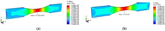 The software ABAQUS is used to analyze the stress of the complete specimen without holes. The mechanical parameters of the material are obtained via static tensile analysis. The stress and strain contours of the model without holes are shown in Figure 6.