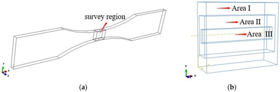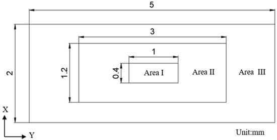 The stress in the middle area of the finite element model is large, and the strain is obviously seen from the stress–strain diagram of the specimen. The stress tends to increase gradually from the middle to the edge. Due to the influence of stress distribution, the damage inside and outside the material is also different. Therefore, the influence of different regions from inside to outside should be considered in the study of fatigue life. Therefore, a local analysis is carried out on the middle rectangular region with a size of , as shown in Figure 7a. The intermediate region is separately divided into three specific regions from the inside out, namely Area 1, Area 2 and Area 3, as shown in Figure 7b.