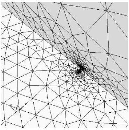 In this paper, FRANC3D software is used to analyze the fatigue crack growth life. The material parameters of 6061-T6 aluminum alloy are built in the software. Considering that the crack initiation is located at the maximum stress of the sharp angle of the material, and the length of the crack macro growth stage is 0.01 mm < a < ac (ac is the critical crack size), the crack is set to an elliptical crack with a long half axis of 0.1 mm and a short half axis of 0.05 mm, as shown in Figure 13. The existence of the hole will affect the overall strength of the material, and the stress at the crack tip is much larger than the stress at the hole. Therefore, three models of hole numbers (0, 50, 100) were set up for the comparative study of crack growth.