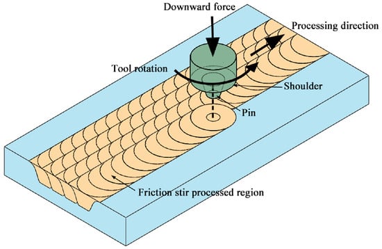Based on the fundamentals of friction stir welding, Mishra et al. [] developed friction stir processing (FSP), a novel solid-state plastic deformation technique that is energy-efficient and environmentally friendly, to modify the microstructure of metallic materials. The FSP technique has several advantages. First, crack and porosity-free modified layers can be produced using FSP as it avoids the bulk melting of the material. Second, significant grain refinement in the processed zone can be achieved due to recovery and dynamic recrystallization during the FSP. Third, the depth and area of the processed zone can be flexibly controlled by varying the tool size, which sets it apart from other severe plastic deformation techniques like high-pressure torsion, accumulative roll bonding, and equal channel angular pressing. The whole specimen can be processed to produce a sizeable bulk material, or we can only process the material’s surface, and the shape of the material remains unchanged.