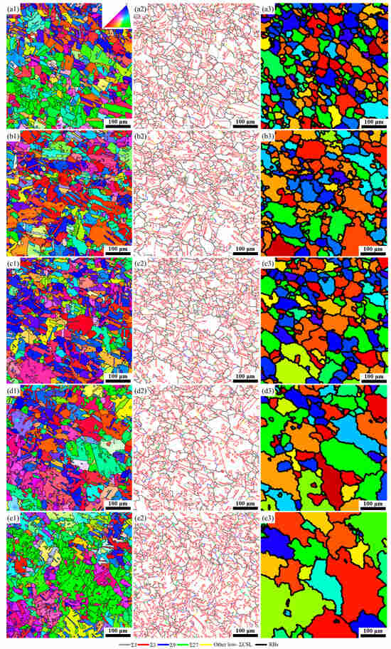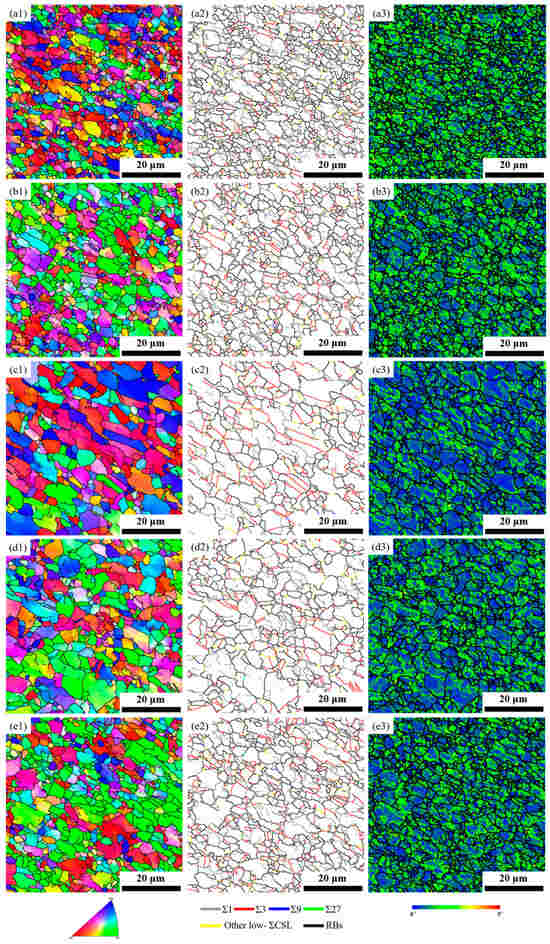 IPF, grain boundary reconstruction, and TRD maps of (a1–a3) A-1, (b1–b3) A-2, (c1–c3) A-3, (d1–d3) A-4, (e1–e3) A-5 specimens.