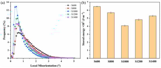 where the grain boundary type determines the parameter α. Generally, the values of tilt boundaries, twist boundaries, and the two types of mixed boundaries are 2, 4, and 3, respectively. is the average local misorientation; represents the shear modulus; means the burgers vector; stands for the step size. According to the studies [,,], the values of , , and were 3, 39 GPa, and 0.128 nm, respectively. In this study, the step size was 0.3 μm. Figure 4b shows the stored energy of the FSPed specimens as calculated by Equation (1). The stored energy in the FSPed specimens first decreased and then increased with the increasing rotational speed. The combined effects of dislocation–dislocation interactions, dynamic recovery, and dynamic recrystallization cause a change in the stored energy. For specimen S1000, the lowest stored energy value is attributed to the weak dislocation–dislocation interactions and the formation of numerous strain-free DRX grains.