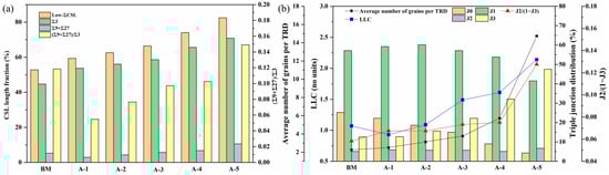 Figure 5(a3–e3) presents the reconstructed TRD maps for the TMP specimens with different rotational speeds. The TRD sizes of specimens A-4 and A-5 were noticeably larger than those of other conditions. The average number of grains per TRD and LLC have been calculated from TRD maps of various specimen conditions for quantitative analysis, as displayed in Figure 6b. The average number of grains per TRD for specimen A-1 was 2.51, which is considerably less than the value for specimen A-5 (15.9). Similarly, specimen A-5 exhibited the largest LLC, indicating the highest order of GBE extent. As previously mentioned, a higher LLC value denotes a higher order of twinning for specimen A-5, resulting in a larger TRD size.