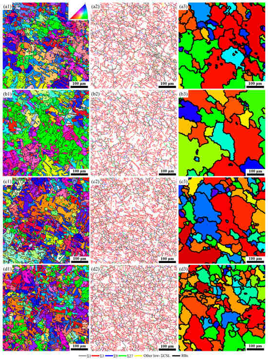 A change in the morphology of Σ3 boundaries can be observed in Figure 7(a2–d2). When the annealing time was 30 min, most Σ3 boundaries manifested as straight twin pairs, commonly regarded as coherent twin boundaries with limited mobility, so it is hard to improve the grain boundary interaction efficiently. An increasing fraction of Σ3 boundaries turned into curved lines as the annealing time was increased to 60 and 120 min, indicating that a higher fraction of incoherent Σ3 boundaries was formed. Some incoherent Σ3 boundaries were annihilated when the annealing time was further extended to 180 min. In terms of GBCD statistics (Figure 8a), the fraction of low-Σ CSL boundaries increased from 74.03% to 82.50% as the annealing time increased from 30 min to 60 min. Nevertheless, when increasing the annealing time to 120 and 180 min, the fraction of low-Σ CSL boundaries decreased to 79.21% and 75.25%, respectively. As the annealing time increased, the (Σ9 + Σ27)/Σ3 ratio initially increased and then gradually decreased, with the maximum value of 0.15 being attained in specimen B-2, resulting in the highest degree of fragmentation of random boundary network connectivity.