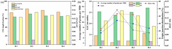 The average number of grains per TRD and LLC value has been determined for the specimen S1400 annealed at 750 °C for different annealing durations, as shown in Figure 8b. With an increase in annealing time, the average number of grains per TRD and LLC increased gradually and then decreased, i.e., specimen B-2 had the maximum number of grains per TRD and LLC value. A greater number of grains per TRD and a higher value of LLC in the specimen indicate a more significant degree of multiple twinning. Moreover, to track the evolution of random boundary network connectivity with the extension of annealing time, the triple junction distribution is also plotted in Figure 8b. A higher value of J2/(1 − J3) signifies a greater disruption in the connectivity of a random boundary network. Specimen B-2 exhibited the maximum J2/(1 − J3) value of 0.31, indicating an effective interruption of random boundary network connectivity. By comparison, specimens B-1, B-3, and B-4 showed relatively intact connectivity of a random boundary network. It is evident from the grain boundary reconstructed maps of these specimens shown in Figure 7(a2–d2). Based on the results above, it can be deduced that specimen B-2 has excellent resistance to intergranular failure.