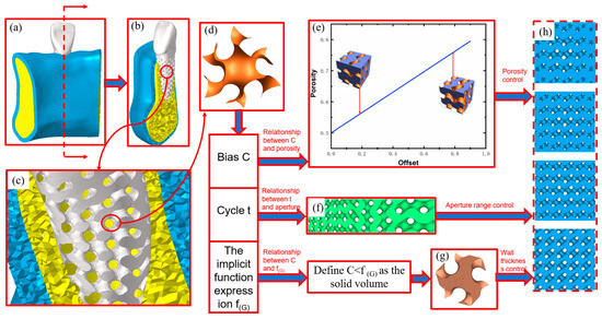 Triply Periodic Minimal Surfaces (TPMS) are periodic in three independent directions in space, and the mean curvature of each point on the surface is 0. Therefore, they have the advantage of having a variety of geometries, and parametric mathematical models can be constructed to describe them, as shown in Figure 1. Figure 1h shows the porous structure with different porosity gradient distributions, which is parametrically designed based on the triply-periodic minimal surface of Figure 1d. Figure 1a–c are the schematic diagrams of the placement of the porous structure and the pre-processing of the finite element analysis.