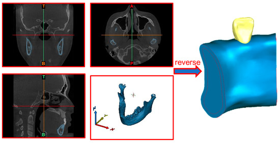 After reading the spiral CT tomographic data in DICOM format using Mimics 21.0(BEL) it was converted into the internal standard format of the software, and the original cross-sectional map was set to be extracted by region splitting and region growing for the extraction of the tooth region and the generation of the tooth mask. Based on the missing teeth mirror model mask, the 3D reconstruction of the missing teeth mirror model was performed. The model was optimized using Geomagic Studio (US) to improve its quality and accuracy. Figure 2 shows the mandible and lateral incisor models extracted from the human head model, with intercepted mandible segments assembled with the lateral incisors, after which the model was used as a basis for finite element pre-processing.