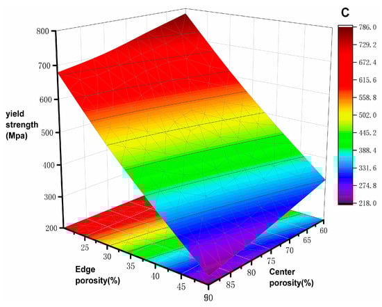 The simulation results of elastic modulus and yield strength are shown in Table 3; the elastic modulus of the natural bone tissue ranges from 0.76–19 GPa, the elastic modulus of all the gradient porous structures tested meet the requirements, and the relationship curves between the mechanical properties of the bone scaffolds and the porosity are plotted according to the data in the table. The elastic modulus of the bone scaffolds is most significant at 60% Pi and 20% Pe with an elasticity modulus of 18.92 GPa and smallest at 90% Pi and 50% Pe with an elasticity modulus of 4.78 GPa, which is 74.7% lower compared with the former. The modulus of elasticity is the smallest at 90% Pi and 50% Pe, which is 4.78 GPa, a decrease of 74.7% compared with the former. In addition, it can be observed from Figure 5 and Figure 6 that when the central porosity is kept constant, the most significant effect on the reduction of elastic modulus is observed in the range of 20–35% for the edge porosity, while the change of the central porosity has a lesser effect on the elastic modulus; the yield strength is maximum at 784.32 MPa for Pi of 60% and Pe of 20%, and the strain at the time of yielding is 0.25; in the case of Pi of 90% and Pe of 50%, the yield strength is minimum at 219.46 MPa, which is 72% lower compared with the former, and the strain at the time of yielding is 0.037. Further, 90% Pe is 50% yield strength, which is the smallest at 219.46 MPa, compared with the former reduced by 72% to reach the yield strain of 0.037. Edge porosity of 20–50% on the yield strength of the law is more consistent; with the edge of the porosity of the more apparent linear relationship, the edge of the porosity of 30% can be more significant to reduce the phenomenon of stress shielding.