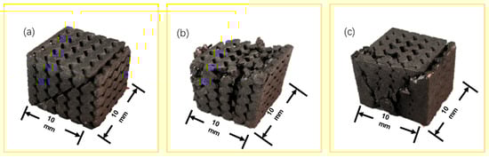 The deformation patterns of the three porous structures recorded during compression are shown in Figure 7. It can be observed that the porous structures with low porosity at the edges and low porosity at the center all show a shear band at 45° to the compression direction at the stage of disruption. During compressive deformation, the dense metal usually fractures in a brittle manner, with the cracks oriented at 45° to the applied stress, and the 45° orientation of the cracks, as shown in Figure 7a, elucidates the brittle deformation behavior of porous Ti6Al4V samples. However, the brittle fracture of porous Ti6Al4V implants is due to the presence of dense walls rather than pores [38]. As the central porosity increases, the central porosity and edge porosity become more and more apparent, and the failure mode of the porous structure is gradually complicated; in the medium-porosity porous structure, the structure presents a section of vertical fracture surface after the edge fracture on the upper surface, until the overall failure of the sample; the fracture of the porous structure with a high porosity gradient occurs on the upper surface. Then, the fracture damage gradually occurs along the two sides, and the which ultimately leads to structural separation. The last part of the structure is separated from the structure in an inverted triangular shape.