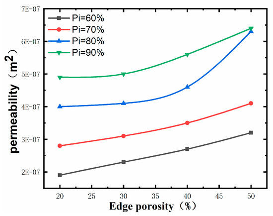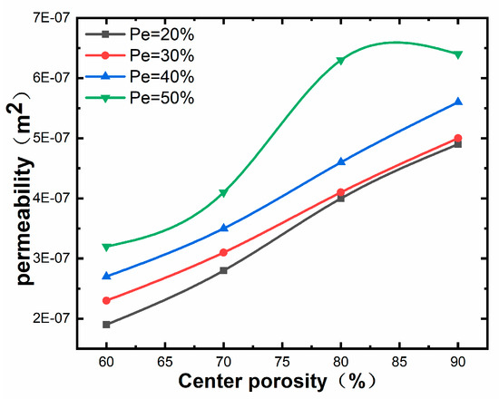 Figure 10 and Figure 11 reveal that the maximum permeability of 6.4 × 10−7 m2 is observed for 90% central porosity and 50% external porosity, and the minimum permeability of 1.9 × 10−7 m2 is observed for 60% central porosity and 20% external porosity. Comparative analysis of Figure 10 and Figure 11 shows that the change in the central porosity has a more pronounced effect on the permeability of the porous structure than the change in the marginal porosity. The effect of change in central porosity on the permeability of the porous structure is more pronounced than that of change in marginal porosity, which can be seen in Figure 11. In contrast, the increase in central porosity does not have much effect on the permeability of the porous structure in the case of higher marginal porosity.