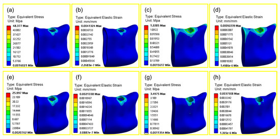 Biomechanical properties of homogeneous and gradient porous structures: (a) Homogeneous cortical bone stress distribution; (b) Homogeneous cortical bone strain distribution; (c) Homogeneous cancellous bone stress distribution; (d) Homogeneous cancellous bone strain distribution; (e) Gradient cortical bone stress distribution; (f) Gradient cortical bone strain distribute; (g) Gradient cancellous bone stress distribution; (h) Gradient cancellous bone strain distribution.
