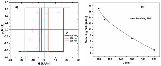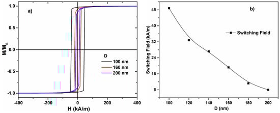 To consolidate the approximation taken, we included other simulations for various diameters but it is very important to mention that the effect is the same (the length is 2 µm and the magnetoelastic constant K = 50,000 J/m3): the switching field decreases when the diameter of the nanowire increases (Figure 5b).