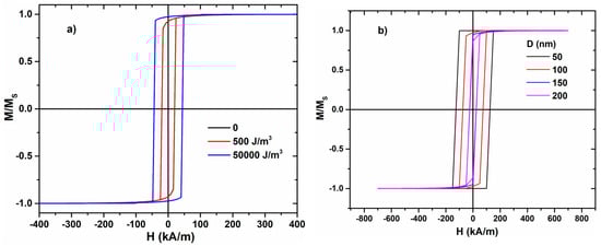 One observes that magnetoelastic anisotropy constants up to 5 × 102 J/m3 do not affect the value of the switching field, as shown in Figure 5a. However, the increment of Kme to 5 × 104 J/m3 results in a drastic increase in the switching field, emphasizing its importance in the magnetization reversal process.