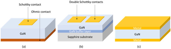 | Device Structure | Schottky or Electrical Contact | GaN Layer Thickness (µm) | Charge Collection Efficiency (%) | References |