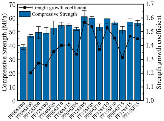 As seen in Figure 5, fiber has a significant effect on enhancing the compressive performance of FRAC, and the compressive strengths of all FRAC specimens with added fiber are higher than those of ordinary FRAC. The compressive strength increments of single PF- and SF-reinforced FRAC ranged from 20.3 to 27.3% and from 35.6 to 40.5%. Among them, the compressive strength of PF12SF05 was the highest, and the increase rate was 56.9%. Furthermore, the lowest increment in compressive strength was obtained for the PF09SF00.