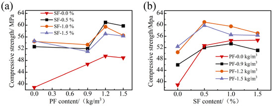 The effect of fiber content on the compressive strength of FRAC: (a) PF; (b) SF.