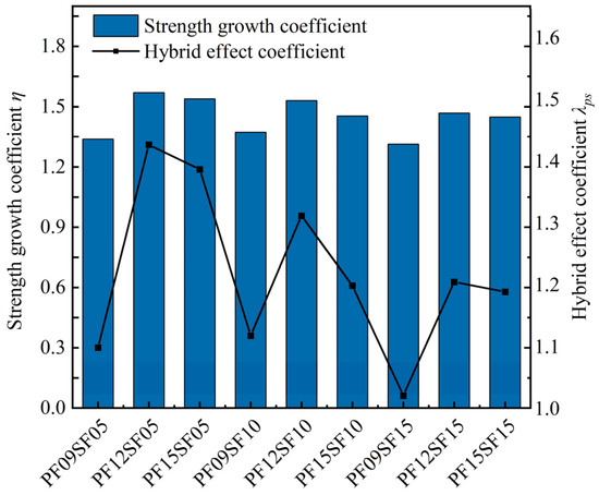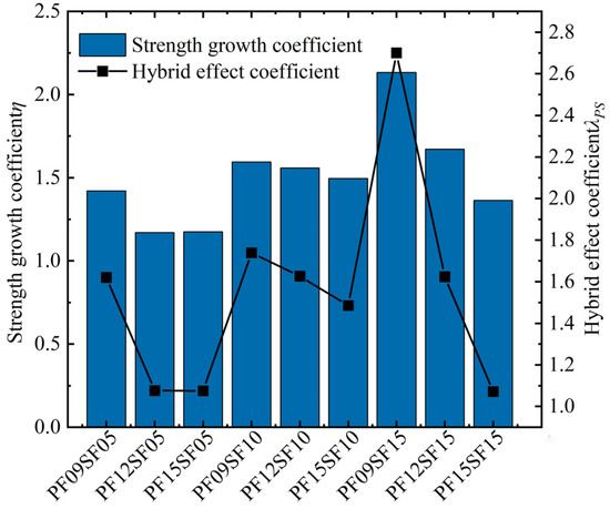 In order to compare the enhancement effect of hybrid fiber on the compressive strength of FRAC more intuitively, the hybrid effect coefficient was introduced in this paper, which was determined by the ratio of the strength growth coefficient. The hybrid effect coefficient can be expressed as follows:
