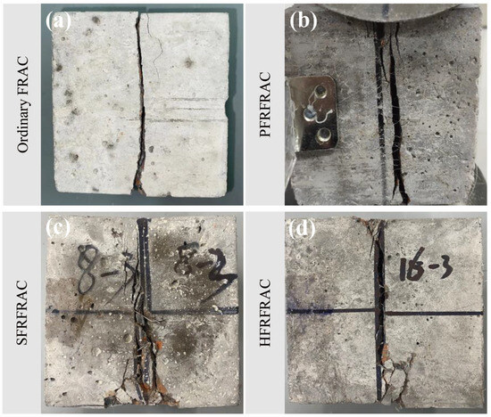 Damage morphology of four FRAC mixtures: (a) ordinary FRAC; (b) PFRFRAC; (c) SFRFRAC; (d) HFRRAC.