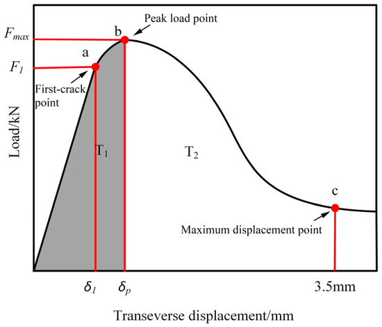 As shown in Figure 9, the splitting tensile load–displacement curve is divided into two regions, T1 and T2, where represents the crack load, is the crack displacement, and a-b is the crack development stage; is the peak load, is the peak displacement, and b-c is the failure stage of the specimen; T1 represents the peak toughness, which is obtained by the integral of the load–displacement curve up to the peak displacement; and the residual toughness T2 can be defined as the integral of the load–displacement curve from the peak displacement up to 3.5 mm.