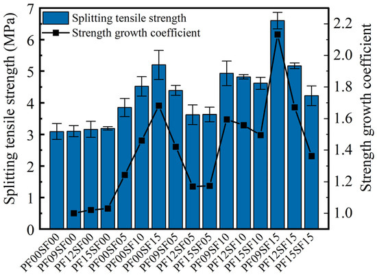 SF played a leading role in the splitting tensile strength and cracking resistance of the FRAC for hybrid fiber mixtures. When the PF dosage was unchanged, an increase in SF dosage significantly enhanced the splitting tensile strength. The splitting tensile strength was the highest among the same SF dosage when the PF dosage was 0.9 kg/m3, and when the SF volume fraction was 0.5, 1%, and 1.5%, the increase compared to ordinary FRAC was 42.1%, 59.5%, and 113.3%, respectively.