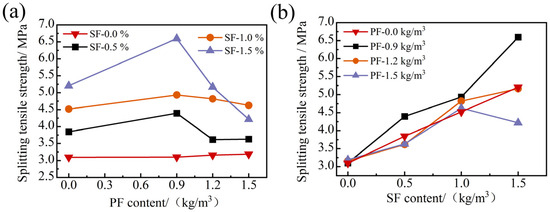 The effect of fiber content on the splitting tensile strength of FRAC: (a) PF; (b) SF.