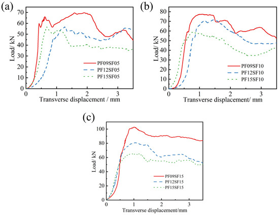 From Figure 14, it can be seen that the peak splitting tensile load decreases with the increase in PF content, and at the same time, the curve of the failure stage also shifts downward as a whole, and the slope of the crack development stage decreases accordingly. This indicated that when the PF dosage was greater than 0.9 kg/m3, blending with SF accelerated the crack development of FRAC, increased the brittleness of the material, and prevented SF from fully exerting its crack resistance and toughening effect, which was exactly the opposite of the situation wherein single PF incorporation increased the toughness of the FRAC. Comparison of Figure 14a–c shows that with the increase in SF volume fraction, the curves become fuller, the range of the load repeatedly rising in the curve decreases, and the slopes of the three curves at different PF dosages become closer and closer during the crack development and failure stage. In addition, when the SF content was 1.5%, the three curves were almost parallel, and the fluctuation was significantly reduced. The inflection point of the curve was caused by the sudden reduction in the resistance of the tensile section due to the withdrawal or fracture of some steel fiber, which showed that the increase in SF content notably improved the stability of the FRAC in resisting tensile failure and reduced the occurrence of sudden brittle failure in some areas of the material [40].