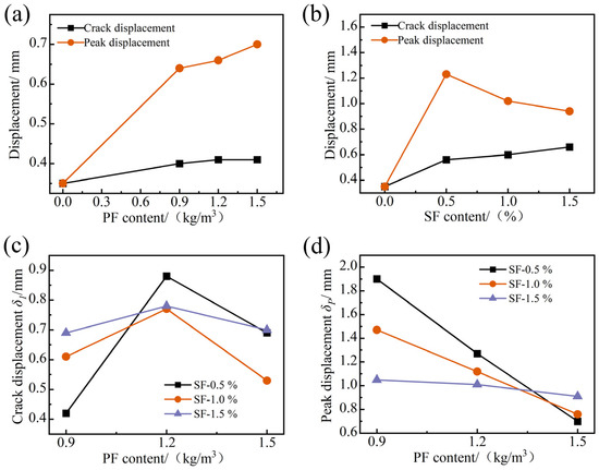 After the peak load, the ordinary FRAC directly cracked into two parts, with the crack point equivalent to the peak point, and the values of and were the same. In Figure 15a, as the PF content increased from 0 to 1.5 kg/m3, the crack displacement increased from 0.35 mm to 0.41 mm with an increase of 17.1%, and the peak displacement increased from 0.64 mm to 0.70 mm with an increase of 10.0% when the PF content increased from 0.9 to 1.5 kg/m3. is the transverse displacement of the FRAC when the load changes suddenly and cracks first occur, and the increase in represents that the FRAC has an enhanced ability to resist tensile stress before cracks are produced, increasing the overall toughness before cracking. is the transverse displacement of the FRAC when it reaches the peak load, and the decrease in represents that the FRAC can better suppress further crack expansion, and its resistance to tensile deformation is enhanced during the crack development stage. It can be concluded that the crack and peak tensile deformation of FRAC is highly affected by the content of PF, and PF can effectively improve the brittleness of the matrix and slow down the occurrence time of cracks, but the inhibitory effect on crack development decreases with the increase in PF content. In Figure 15b, as the SF content increased from 0 to 1.5%, monotonically increased from 0.35 mm to 0.66 mm with an increase of 88.6%, and decreased from 1.23 mm to 0.94 mm with a decrease of 30.9% when SF content increased from 0.5 to 1.5%. This shows that the increased SF content can effectively improve the crack resistance of FRAC under tensile stress and can enhance the inhibition effect on crack expansion during the crack development stage.
