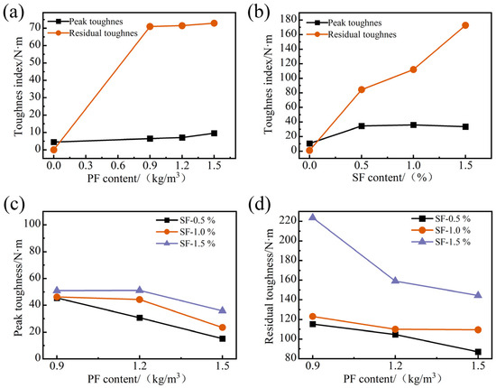 In Figure 16a, the values of T1 and T2 increased with the increase in PF content. When the PF content increased from 0.9 kg/m3 to 1.5 kg/m3, the increase in T2 was only 2.66%, and the increase in T1 was 47.86%, which was 110.16% compared with the ordinary FRAC. Since the ordinary FRAC cracked into two parts directly after the peak load, its residual toughness T2 was zero, and T2 reached 71 N·m when the PF dosage was 0.9 kg/m3. However, increasing the PF dosage afterward did not significantly improve the residual toughness T2. From Figure 16b, it can be seen that SF has a remarkable effect on improving the toughness of FRAC. As the volume fraction of SF increased, the peak toughness of SFRFRAC did not change much, but it increased by an average of more than 6 times compared to ordinary FRAC. The residual toughness increased with the increase in SF content, and the peak toughness increased by 105.1% when the SF content increased from 0.5% to 1.5%.
