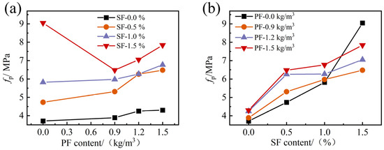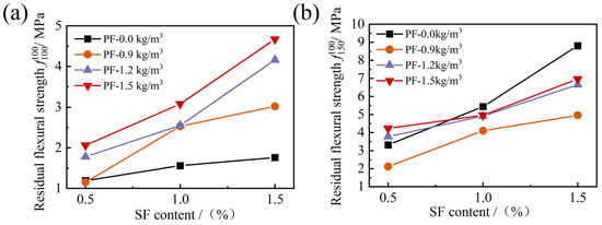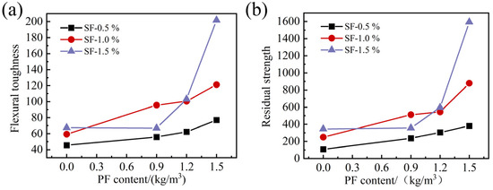As can be seen in Figure 20, when the PF content was unchanged, the increase in SF content remarkably increased the residual flexural strength, and and increased by more than 0.5 MPa as the SF dosage rose by 0.5%, indicating that the FRAC with high SF content had a solid load-holding capacity after flexural damage. When the SF content was fixed, increased monotonically with the increase in PF content, but did not always increase with the increase in PF content. From Figure 20b, it can be seen that the addition of PF inhibited the enhancement effect of SF on the flexural performance of FRAC with high SF content to some extent and weakened the load-holding capacity of the specimen after flexural failure. As the PF dosage continued to increase, the residual strength also increased, but it is overall less than that of the single SF-reinforced FRAC under the same SF dosage.