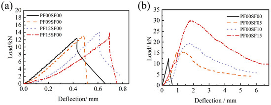 Flexural load–deflection curve of FRAC with single fiber: (a) PF; (b) SF.