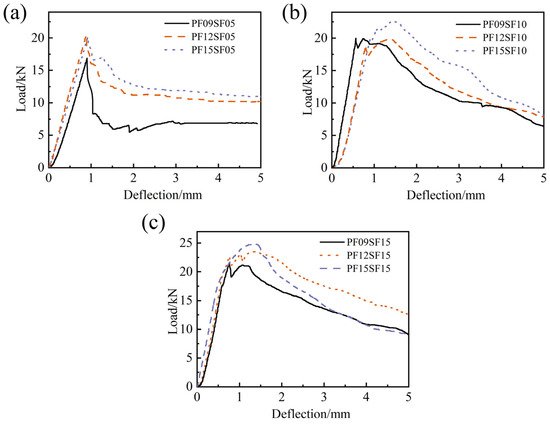 Figure 22 shows the flexural load–deflection curves of FRAC specimens with different PF contents at SF dosages of 0.5%, 1.0%, and 1.5%. It can be seen that at the same SF content, the slope of the ascending part of the curves does not differ much, and the peak deflection changes slightly. With the increase in SF content, the curve became more stable during the failure stage, and the fluctuation phenomenon caused by the secondary strengthening of the load gradually decreased. In Figure 22a,b, the curve showed an overall upward trend with the increase in PF dosage, which is fuller and has a larger peak load compared with that of the SFRFRAC at the same dosage. The difference between the three curves in Figure 22c was not obvious, and the slope of the ascending part was almost the same, but the peak load and area of the curves were remarkably reduced. This indicated that the high SF volume fraction of 1.5% reduced the maximum load that the FRAC bore under bending moments, while further evidence is needed as to whether it reduced the toughness of the FRAC.