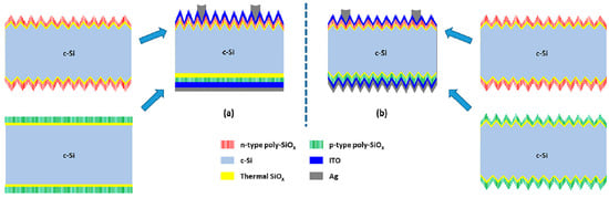 (a) A single-sided textured (SST) poly-SiOx passivated crystalline silicon (c-Si) solar cell, featuring symmetric n-type doped poly-SiOx on a double-sided textured (DST) substrate at the top and symmetric p-type doped poly-SiOx on a double-sided polished (DSP) substrate at the bottom; (b) a DST poly-SiOx passivated c-Si solar cell, equipped with symmetric n-type doped poly-SiOx on the top and symmetric p-type doped poly-SiOx, both situated on DST substrates. “ITO” refers to indium tin oxide. Reprinted with permission from ref. [], copyright 2023, Progress in Photovoltaics: Research and Applications.