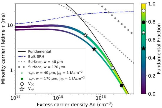 Model for the effective minority carrier lifetime in structures using n-type wafers of thicknesses of 170 μm and 40 μm. These wafers are characterized by a bulk Shockley–Read–Hall (SRH) lifetime of 10 ms, a bulk resistivity of 3.55 Ω cm (equivalent to a dopant concentration of 1.3 × 1015 cm⁻3), and a combined surface recombination velocity (J0S) of 1 fAcm⁻2 from both surfaces. In the accompanying plots, various curves are used to distinguish between different recombination mechanisms. A color bar is included to denote the proportion of fundamental recombination, which encompasses both Auger and radiative processes. The black star represents the maximum voltage at a close circuit, whereas the black circle represents the power voltage at a close circuit. The generation current for these wafers is determined based on the appropriate Lambertian light trapping limit for each specific thickness. Additionally, markers within the color bar highlight the proportions of fundamental recombination at the points of maximum power and during open-circuit injections. Reprinted with permission from ref. [], copyright 2020, Journal of Materials Chemistry A.