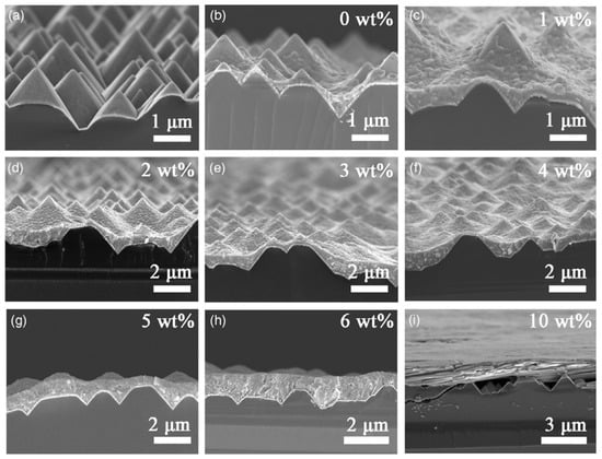 Cross-sectional scanning electron microscopy (SEM) images illustrating (a) a silicon surface textured with pure pyramids and (b–i) the same pyramid-textured silicon surface overlaid with perovskite films, each with varying starch ratios. These ratios include (b) 0 wt%, (c) 1 wt%, (d) 2 wt%, (e) 3 wt%, (f) 4 wt%, (g) 5 wt%, (h) 6 wt%, and (i) 10 wt%. Reprinted with permission from ref. [], copyright 2020, Energy Technology.