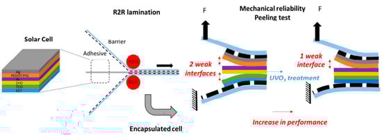 Process flow for enhancing the durability and performance of organic photovoltaic devices. The illustration shows a multilayered solar cell structure being encapsulated through roll-to-roll (R2R) lamination, identifying two weak interfaces that are prone to separation. A mechanical peeling test is used to assess the mechanical reliability. Subsequently, UV–ozone (UVO3) treatment is applied to one of the interfaces, resulting in improved adhesion, a reduction to one weak interface, and an overall increase in the solar cell’s performance. Reprinted with permission from ref. [], copyright 2018, ACS Applied Materials and Interfaces.