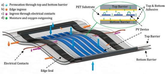 Scaling OPVs for widespread use involves overcoming several technological challenges, particularly concerning the inherent instability of organic materials and the complexities of large-scale production. The primary challenge in scaling OPVs is the inherent instability of organic materials. These materials can degrade under environmental stressors such as UV light, oxygen, and moisture. Sutherland et al. [] argue that the development of flexible barrier encapsulation is essential, which requires materials with exceptional moisture resistance, high transparency, and durability against mechanical stress. Their review discusses these challenges in detail and examines the latest advancements in flexible encapsulation materials, suggesting directions for future research. Figure 5 shows four distinct routes through which moisture and oxygen can penetrate flexible encapsulated PSC and OPV devices.