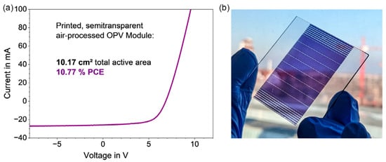 Transitioning from small-area lab cells to large-scale, industrially viable OPV modules presents significant challenges. Wachsmuth and colleagues [] explored the upscaling of OPVs from small-area lab cells to solution-processed modules that are compatible with industrial roll-to-roll (R2R) printing. This process involved meticulous material selection and optimization of each layer in the OPV stack, including the photoactive and charge-transporting layers, as well as the solution-processed top electrode. The authors also conducted long-term stability tests (thermal and light exposure) and successfully scaled up the device area by over 100 times. The result was a semitransparent OPV module with a 10.8% power conversion efficiency on a 10.2 cm2 area, meeting industrial R2R printing requirements, thus paving the way for large-scale production (see Figure 6).