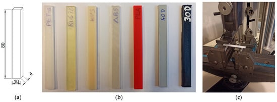 (a) The dimensions of the cuboid-shaped specimen for the three-point loading test (unit: mm); (b) the samples made of the selected polymers; (c) the specimen mounted in the Zwick Roell machine (https://www.zwickroell.com/; accessed on 28 February 2024).