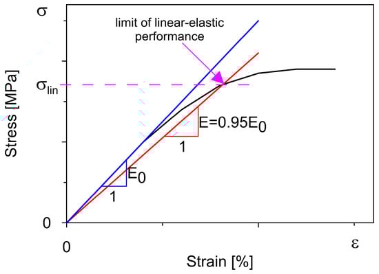 The determination of the linear-elastic limit of a filament is shown schematically in Figure 4 [,]. Materials printed using 3D technology may exhibit slightly non-linear behaviour even at small strains. Therefore, it was assumed that the analysed polymers would work in the linear-elastic range until the secant elasticity modulus E, determined for the current value of stress and strain, was not less than 95% of its initial value E0 (i.e., E = 0.95E0). The initial value of the elasticity modulus E0 was assessed based on the stress–strain relationship for the strain range 0.05–0.25%.