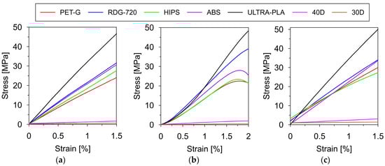 The elastic modulus of each filament was determined based on the three independent methods: (1) the uniaxial tensile test, (2) the compression test, and (3) the three-point loading test (see Section 2.3.1). The chosen stress–strain relationships for all polymers obtained from tensile, compression, and bending tests are presented in Figure 5.