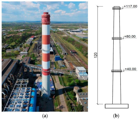 Determining the material properties of the polymers allows for similarity scale calculation. An existing reinforced concrete chimney 120 m high was chosen as a prototype for further consideration [] (Figure 6). The shaft’s diameter varied from 5.5 to 8.7 m. Its thickness was in the range of 18–50 cm. The thickness of the ceramic lining was 25 cm. The thickness of the carbon deposits, measured in the inspection of the structure, was approximately 5 cm. The elasticity modulus of the shaft was 32 GPa. The mass density of the shaft and the ceramic lining were 2500 and 2400 kg/m3, respectively. The mass density of the carbon deposits was 1900 kg/m3.