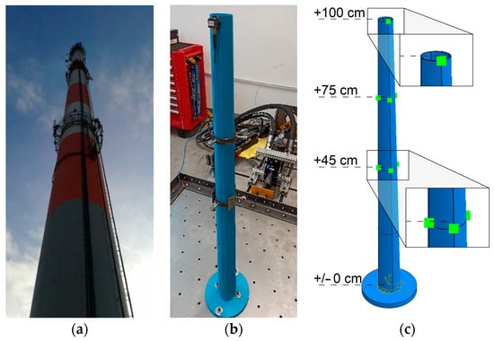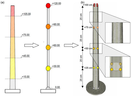 Additional masses, reflecting the ceramic lining in the prototype, were attached to the model at three levels: 1.0, 0.75, and 0.45 m above the ground. According to the mass similarity scale, the values of the masses were 12, 88, and 200 g. At the levels of 0.75 and 0.45 m, the masses were added in the form of steel clamps. At the top level, a 12 g accelerometer was attached to the model. The laboratory model and the numerical model of the mock-up with lumped masses are presented in Figure 10b,c, respectively.