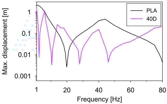 For a natural frequency determination, sweep excitation at a frequency close to the expected natural frequency is usually applied to the model. The model operates strictly in the resonance zone and the linear-elasticity limit may be exceeded. Therefore, it is reasonable to numerically estimate the maximum acceleration (or displacement) of the shaking-table beyond which the non-linear work of a model occurs. To recognize the maximum displacement, numerical calculations were performed for two models made of polymers with extremely different acceleration similarity scales, i.e., the model made of the ULTRA-PLA and the 40D material. Sinusoidal kinematic excitations at frequencies from 0 to 80 Hz (every 0.5 Hz) were used to excite the models. The damping ratio of 1% was adopted as a typical value for 3D-printed materials [,]. The calculated maximum shaking-table displacements (as a function of the excitation frequency), at which the models made of the ULTRA-PLA and the 40D filament still operate in the linear-elastic range, are shown in Figure 9. For example, the relationship shows that the maximum displacement at the first resonant frequency is 3 mm for the ULTRA-PLA filament, whereas the relationship for the 40D filament indicates the maximum displacements of 7, 3, 4, and 5 mm at the four subsequent natural frequencies. Exceeding these values leads to changes in the elastic moduli of the filament, and therefore, the similarity criteria are no longer valid.