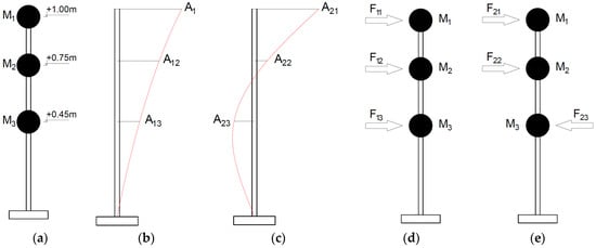 The lumped masses attached to the model were M1 = 0.100 kg, M2 = 0.263 kg, and M3 = 0.433 kg. The amplitudes of the first and the second eigenmodes were A11 = 1.00, A12 = 0.68, A13 = 0.34, and A21 = 1.00, A22 = 0.16, A23 = −0.48, respectively. The maximum accelerations recorded at the top of the model while tracking the first and the second frequency were a1 = 35 m/s2 and a2 = 4 m/s2, respectively. Based on these data, the inertia forces acting on the model were calculated for the first and the second natural frequency: